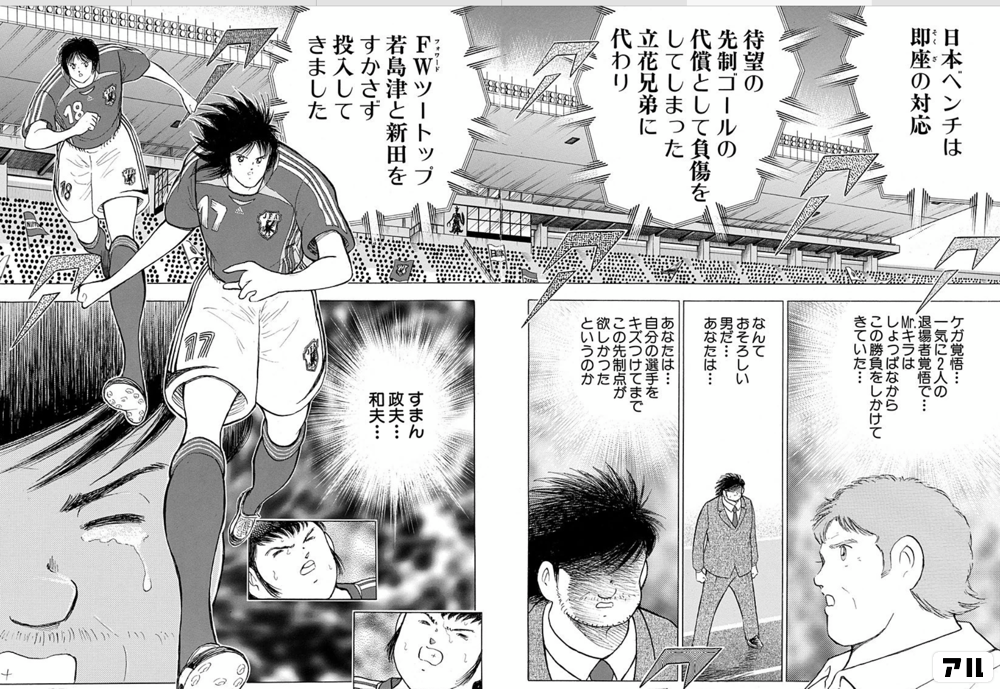 日本ベンチは即座の対応 待望の先制ゴールの代償として 負傷をしてしまった立花兄弟に代わり fwツートップ 若島津と新田をすかさず投入してきました ケガ覚悟 一気に2人の退場者覚悟で Mrキラはしょっぱなからこの勝負をしかけてきていた なんておそろしい男だ あなた